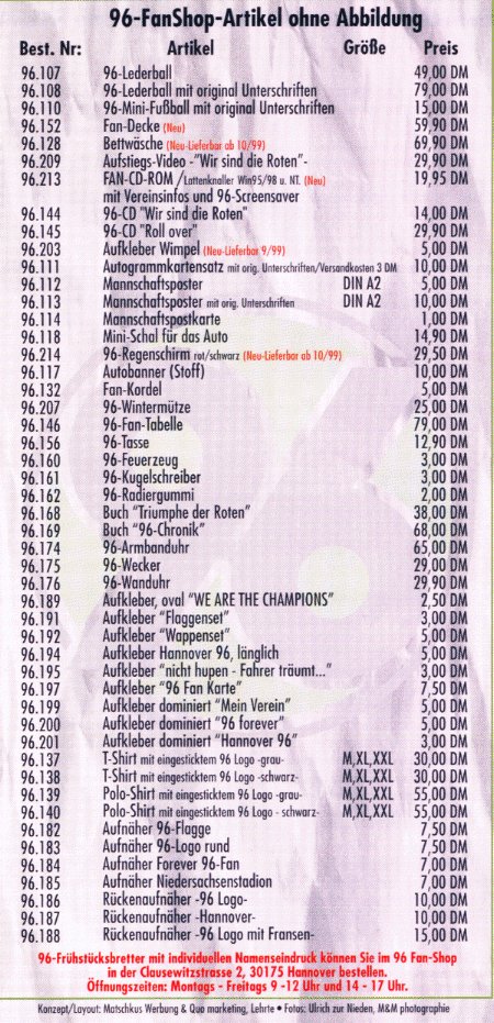 Der 96-Fan-Shop-Katalog 1999 / 2000 präsentiert Euch wieder schöne Fanartikel von Hannover 96.